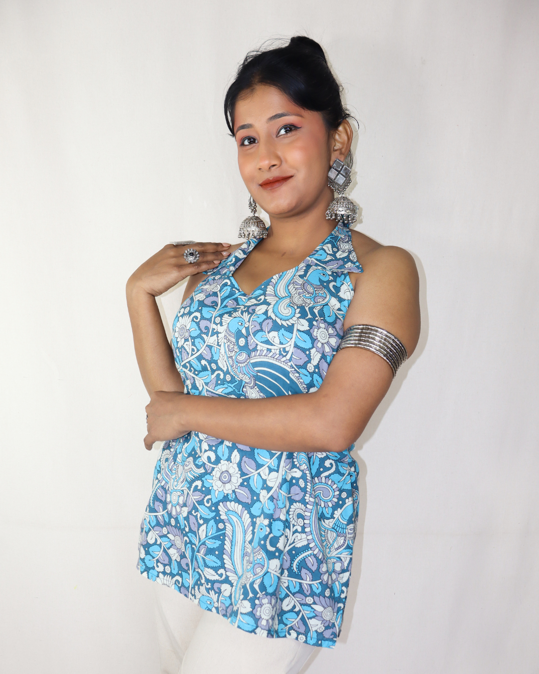 This women’s halter neck kurti is designed with an all-over paisley and floral print in soothing shades of blue and white, offering a fresh and elegant look. Crafted from 100% pure cotton with a soft cotton lining, it ensures breathability and comfort, making it ideal for warm-weather wear.